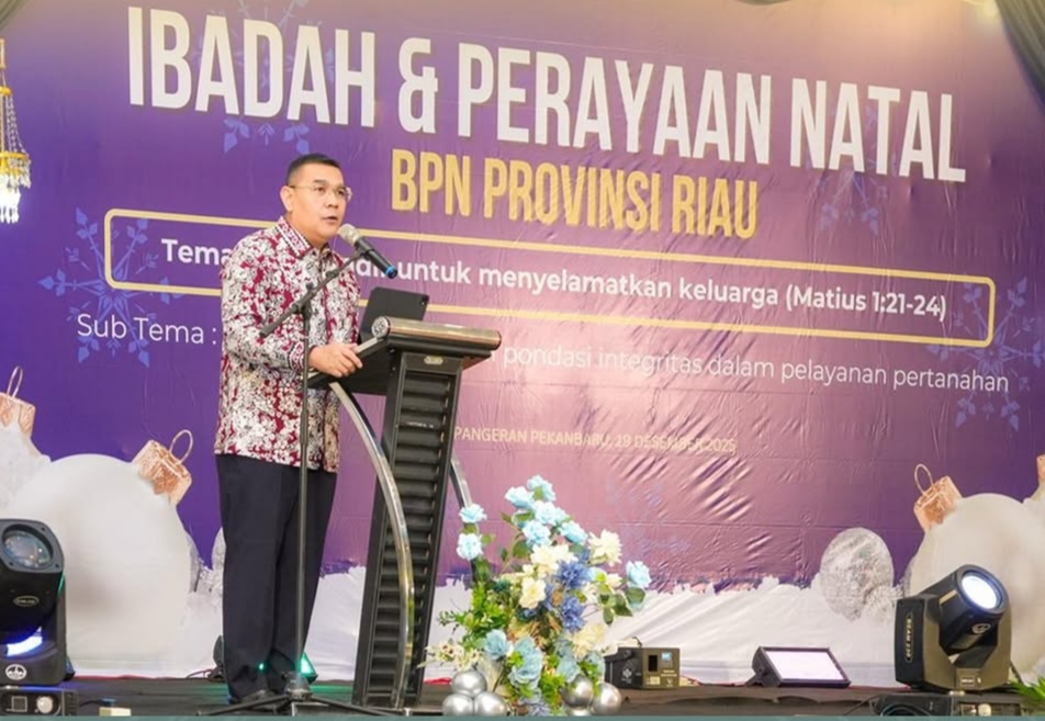 Pekanbaru - Natal dinilai menjadi momentum untuk memperkuat nilai spiritual dan etika kerja dalam menjalankan tugas pelayanan publik. Pada perayaan Natal yang diselenggarakan Kantor Wilayah (Kanwil) BPN Provinsi Riau, Wakil Menteri Agraria dan Tata Ruang/Wakil Kepala Badan Pertanahan Nasional (Wamen ATR/Waka BPN), Ossy Dermawan, mengajak seluruh jajaran untuk terus menjaga semangat pengabdian di tengah berbagai tantangan yang dihadapi.