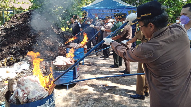 Pembakaran daging ilegal tanpa dokumen sah ini dilakukan di lokasi Tempat Pembuangan Akhir (TPA) sampah di Kecamatan Bantan, Senin (29/5/2023).
