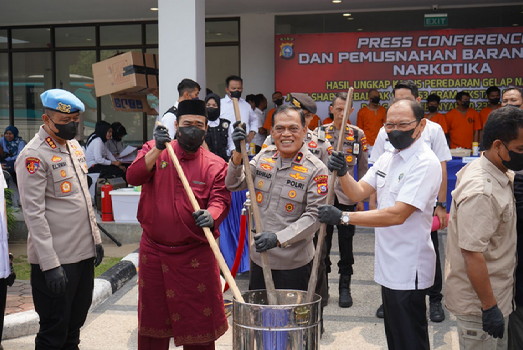 BNEWS - Wakapolda Riau Brigjen Pol K Rahmadi memimpin acara pemusnahan barang bukti narkoba sebanyak 9,949,52 gram sabu, 60.23 Kg ganja dan 54.623 butir ekstasi.