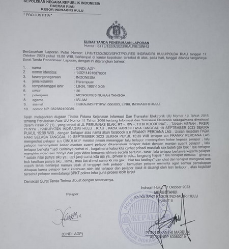 BNEWS - Pelaku penyebaran video porno ke seorang wanita dengan inisial FR resmi dilaporkan oleh korban, C, ke Polres Indragiri Hulu (Inhu), dengan nomor : LP/B/132/X/2023/SPKT/Polres Indragiri Hulu/Polda Riau.